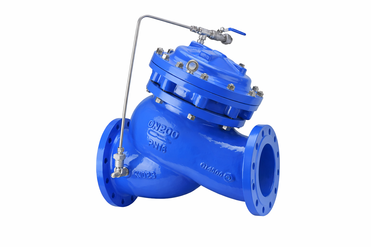 This float control valve is a hydraulically driven automatic control valve used to control the filling and liquid level of a reservoir or water tank. The filling is controlled by an adjustable horizontal float. The water filling of the reservoir is controlled by the horizontal float to open the valve at a preset low water level of the reservoir and close the valve at a preset high water level. It is mainly used in urban water supply, building water supply, agricultural irrigation, industrial water and other occasions.